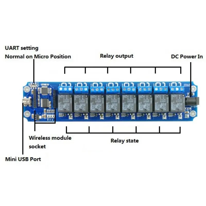 Ce kit dispose de huit sorties relais à contact sec, chacune capable de gérer une nominale de courant allant jusqu'à 10 Amperes. Il fonctionne avec une alimentation de 5VDC ou USB, assurant une flexibilité dans les options d'alimentation. Les relais sont de type SPDT, offrant des capacités de commutation fiables pour diverses applications.