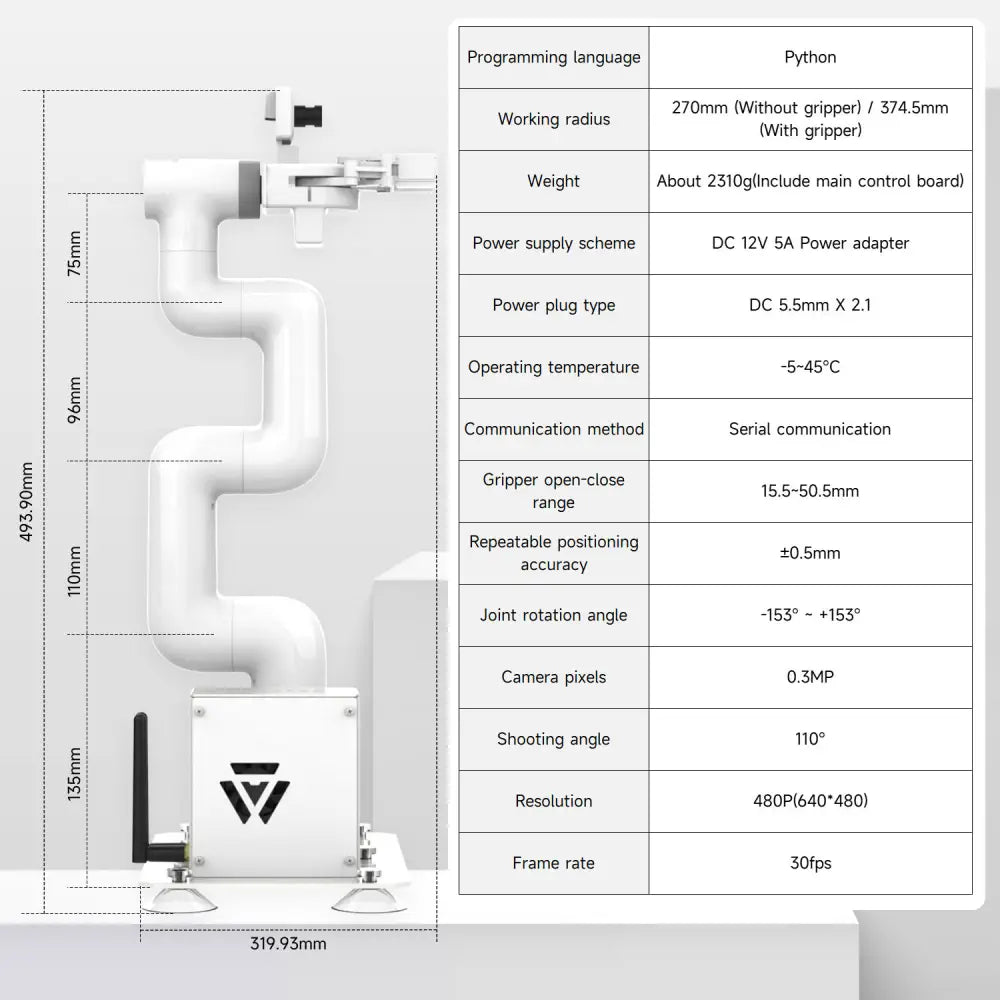JetCobot adopts a 7-axis design, has a configuration similar to the UR robot, and with the inverse kinematics algorithm, it ensures flexible and precise motion control. The maximum effective arm span is 270MM, the joint rotation range is -153°~153°, and it can handle a variety of complex operation tasks.