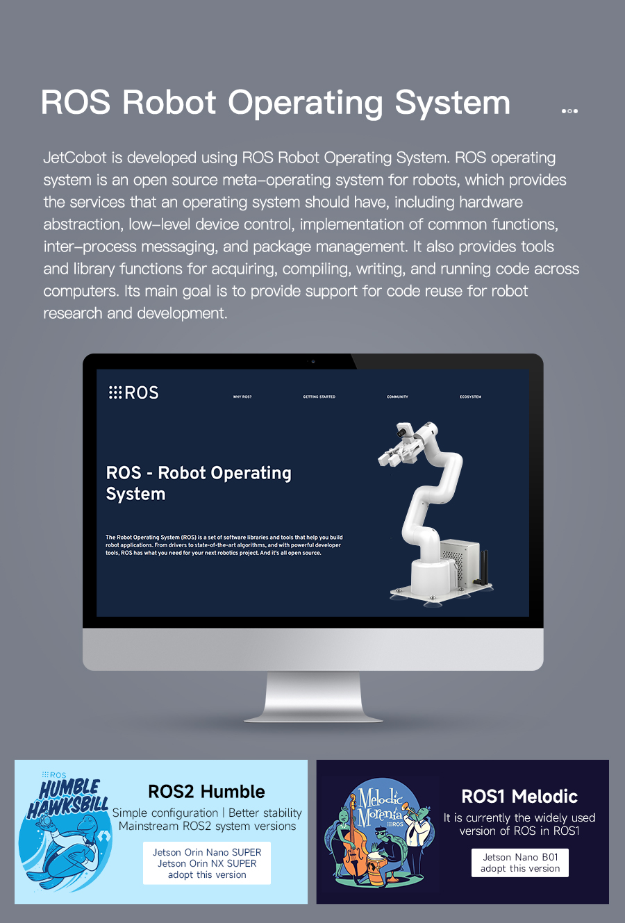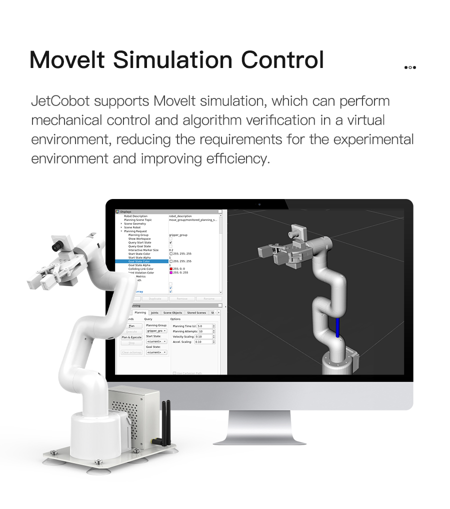 Based on the ROS robot operating system, JetCobot can realize MoveIt simulation control, and also supports APP control(Just for Android), handle control and PC web control to meet the needs of different users.