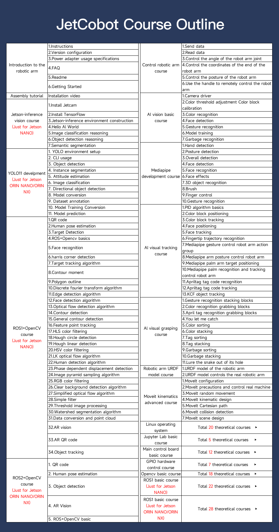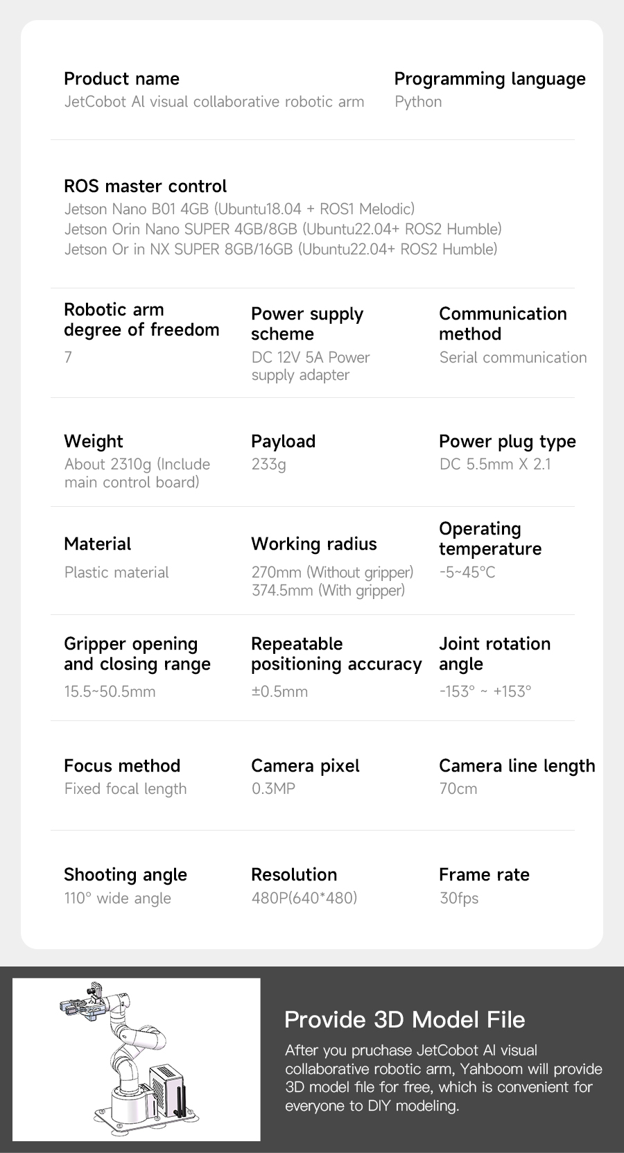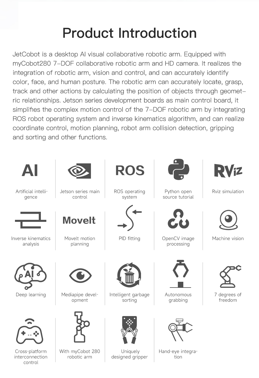 JetCobot is a 7-axis visual collaborative robotic arm. It uses the NVIDIA series development board as the main control board. It adopts a configuration similar to the UR robot, flexible movement, and maximum effective arm span of 270MM. Through the ROS robot operating system and inverse kinematics algorithm, the robotic arm coordinate control, motion planning, gripping and sorting functions are realized. It equipped it with a 0.3MP USB camera, combined with OpenCV images, machine vision, deep learning and other algorithms, can complete color interaction, face tracking, label recognition, model training, gesture interaction and other functions. In addition to supporting MoveIt simulation control, JetCobot also supports APP, handle, PC web control.